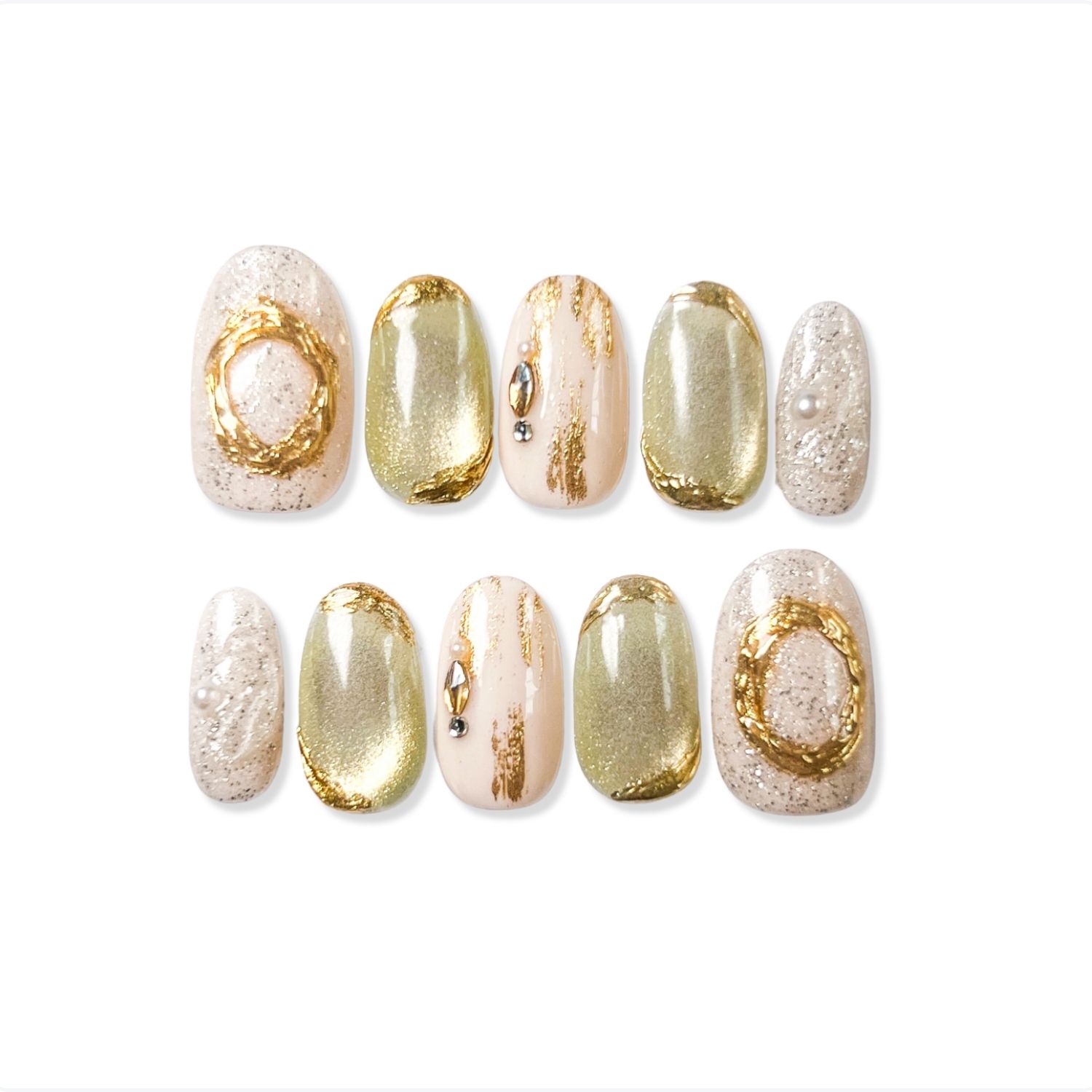 くすみグリーンとゴールドの輝きが調和した、大人の抜け感ネイル。ナチュラルで季節問わず使えます。