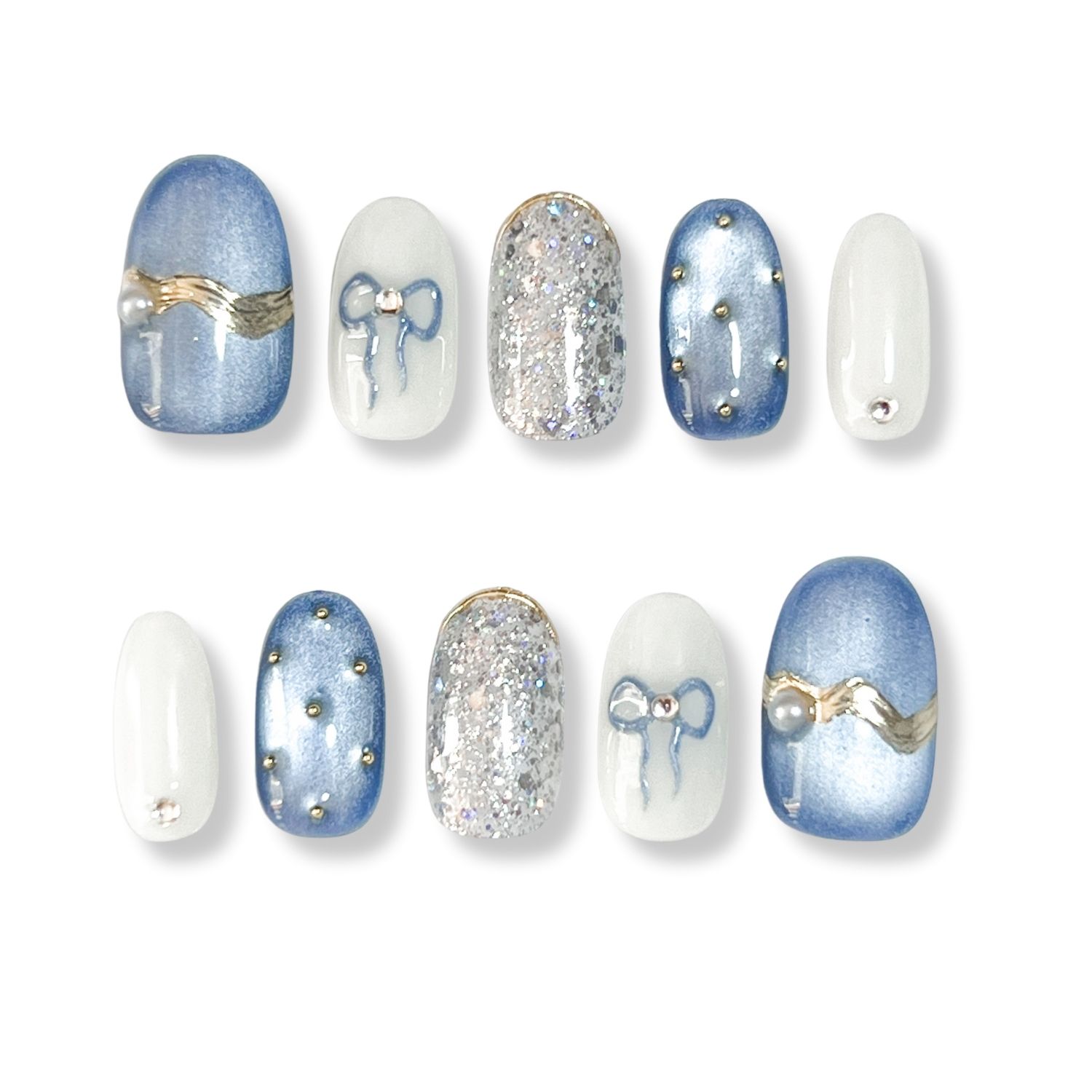 ブルー×ホワイトの爽やかカラーに、リボンとラメがきらめく夏にぴったりの上品ネイル。